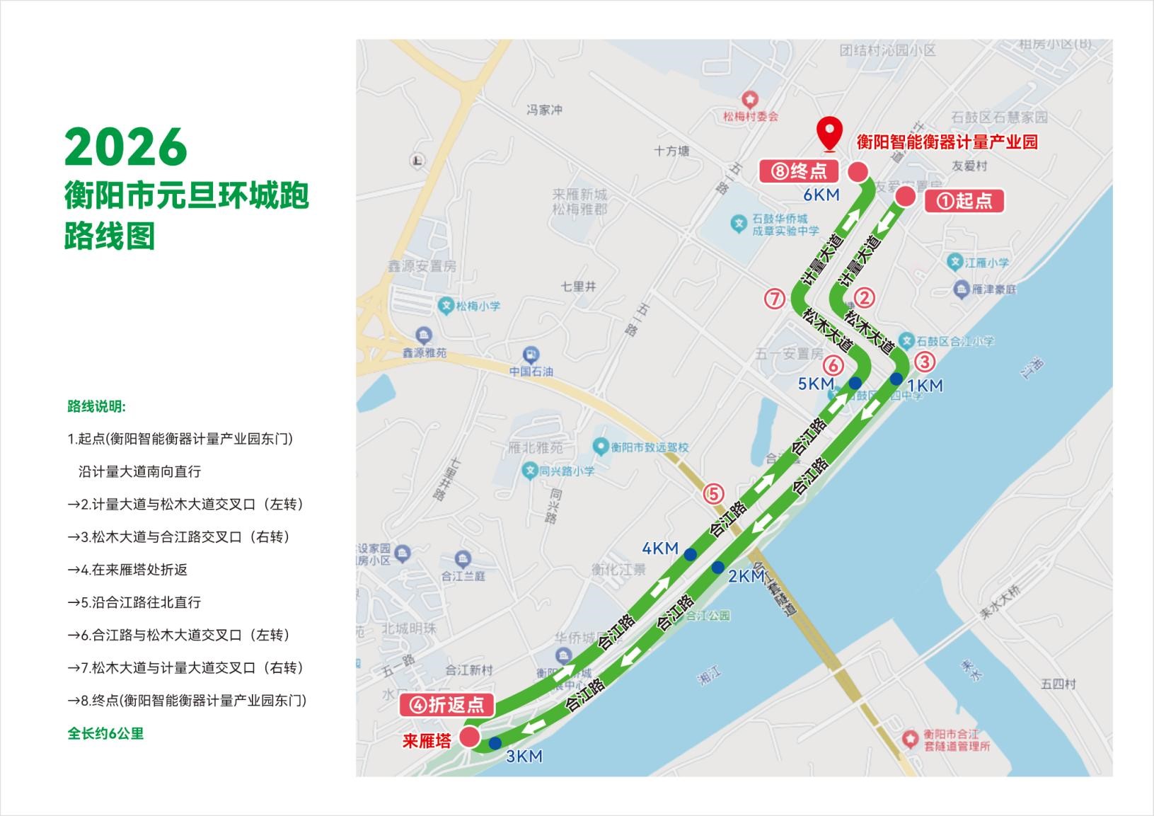 4、路线及起终点:衡阳智能衡器计量产业园东门(起点)沿计量大道南向直行—计量大道与松木大道交叉口(左转)—松木大道与合江路交叉口(右转)—在来雁塔处折返—沿合江路往北直行—合江路与松木大道交叉口(左转)—松木大道与计量大道交叉口(右转)—衡阳智能衡器计量产业园东门处(终点)